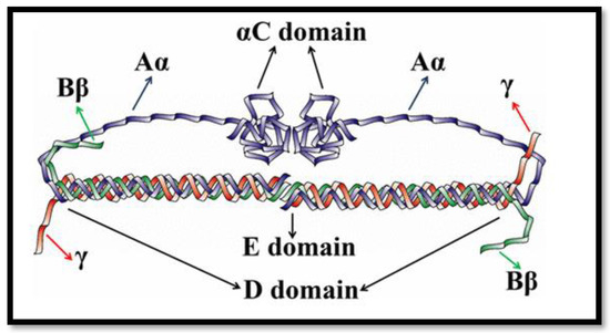 Fibrinogen’s molecular mass is 340 kDa, and it consists of six polypeptide chains (two Aα, two Bβ, and two γ). The Aα, Bβ, and γ polypeptide chains are made up of 610, 461, and 411 amino acid residues, respectively [18]. The molecular mass of each chain is 66.5, 52, and 46.5 kDa, respectively [19]. The chains are held together by disulfide bonds, and they intertwine, forming a structure of globular regions which are connected. These regions are the E domain, two D domains, and two αC domains. The E domain contains the N-terminals of the all the polypeptide chains, whereas the D domains combine the C-terminals of the Bβ and γ chains. The remaining C-terminals of the Aα form the two αC domains [20,21]. The E domain is linked to the two D domains by α-helical coiled coils [22]. In comparison to the αC domains, the E and D domains are much more hydrophobic [23]. Furthermore, at physiological pH, the αC domains are positively charged while the E and D domains possess negative charges [24].