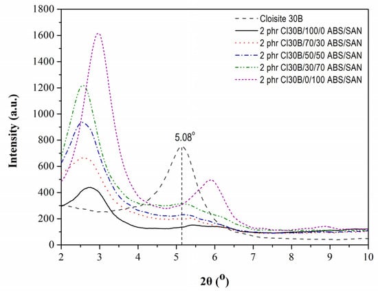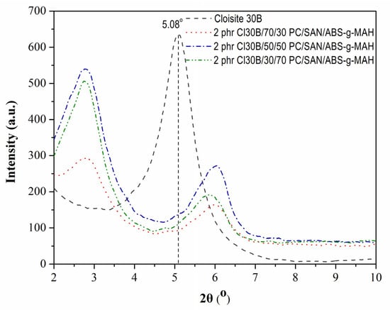 From Figure 1, the characteristic peak (001) of Cloisite 30B can be observed at about 2θ = 5.08°, corresponding to an inter-layer spacing of 1.74 nm. The XRD patterns of the Cloisite 30B/ABS/SAN and Cloisite 30B/PC/SAN blends in Figure 1 and Figure 2, respectively, show that the peak corresponding to the (001) plane reflection of clay shifts to lower angles. The increased d-spacing suggests that the polymer chains intercalated into the gallery of nanoclay and increased the distance between the nanoclay layers [24], due to the strong shear during melt blending [25]. According to the literature [17], most of the clay platelets are located in the SAN phase, as well as in the phase boundaries of PC/SAN blends. The intercalation of SAN chains, present in ABS or SAN phase of ABS/SAN and PC/SAN blends, inside the clay galleries is driven by the interactions between the nitrile groups of the SAN phase and the hydroxyl groups of the organic modifier of nanofiller [26,27,28,29]. There is also a slight possibility of hydrogen bonding between the nitrile groups of SAN and the ammonium cation of the intercalating agent [26]. The intercalation of PC chains in PC/SAN blends is caused by the hydrogen bonding between carbonyl groups in PC and the hydroxyl groups of the organic modifier of Cloisite 30B [30].