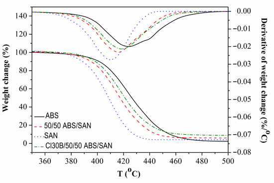 The incorporation of organoclay in ABS/SAN blends slightly improves their thermal stability, mainly at a composition of 30/70 w/w, as the concentration of the elastomeric non-polar phase, which does not interact with the nanofiller, is lower. The increase in thermal stability of ABS/SAN nanocomposites can be attributed to the “labyrinth” effect of clay layers. Since the layers of organo-modified silicate are impermeable to the small molecules generated during the thermal decomposition process, the decomposition products have to take a long way around the clay layers [36,37,38]. The improvement of thermal stability is also ascribed to the protection of polymer chains intercalated into the clay galleries and to the confinement of their movements [38]. The “barrier” effect of clay [29,39] and the formation of char on the composite surface insulate the underlying material and inhibit the escape of volatile products generated during thermal decomposition [29]. An increase in residue is recorded in ABS/SAN nanocomposites, compared to the non-reinforced blends (Figure 4).