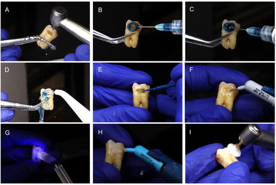 (A) Preparation of the cavity of standard dimensions on the buccal face of one of the samples. (B) Acid etching of enamel with 35% orthophosphoric acid for 30 s. (C) Acid etching of dentin with 35% orthophosphoric acid for 15 s. (D) Washing with air/water jet for 30 s. (E) Placement of Prime & Bond Universal adhesive system throughout the prepared cavity. (F) Placement of a 2 mm increment of SDR®® flow+ resin under the adhesive layer. (G) Light curing of the SDR®® flow+ resin layer. (H) Final 1 mm increment placement of Spectra ST HV resin. (I) Polishing of the restoration.