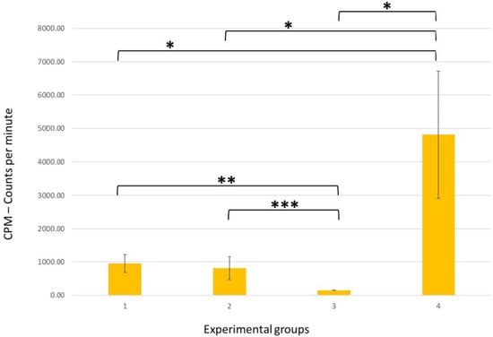 Visual representation of mean values and standard deviation of the total counts in each group and the significance level between groups: * p < 0.05; ** p < 0.01; *** p < 0.001; ns—not significant; Y-axis—CPM—the measurement count of the radioactive isotope per minute; X-axis—groups—1 and 2 (experimental groups), 3 (negative control group), and 4 (positive control group).