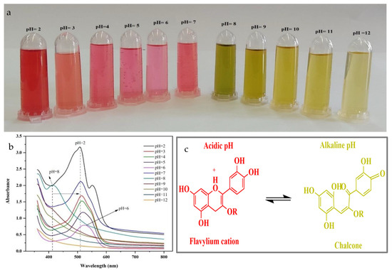 (a) The appearance of the HSA solutions; (b) UV–vis spectra of HSA solutions at different pH values; (c) Chemical structure of anthocyanins at different pH values.