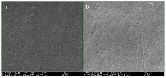 SEM was used to provide insights into the morphology of the chitosan-based labels (Figure 2a,b). The labels formed from chitosan had smooth, homogeneous, and compact surfaces in both the presence and absence of the HSAs. There was no evidence of cracks or other irregularities in the films containing the HSAs, suggesting that the anthocyanins were well dispersed within the chitosan matrix. This phenomenon can be attributed to the existence of OH groups in the anthocyanins, which can form intramolecular H-bonds with the chitosan molecules [31,32].