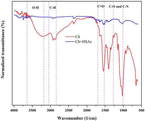 FTIR spectra of pure chitosan and HSA-loaded chitosan labels.