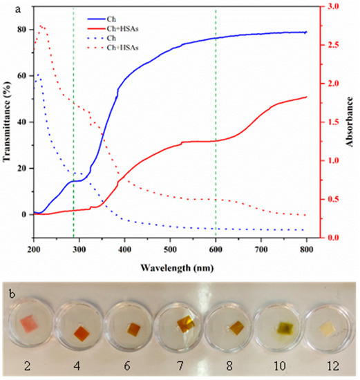 (a) Impact of wavelength on the UV–visible transmittance and absorbance of pure chitosan and HSA-loaded chitosan labels; (b) Photographs of the HSA-loaded chitosan labels at pH values ranging from 2 to 12.