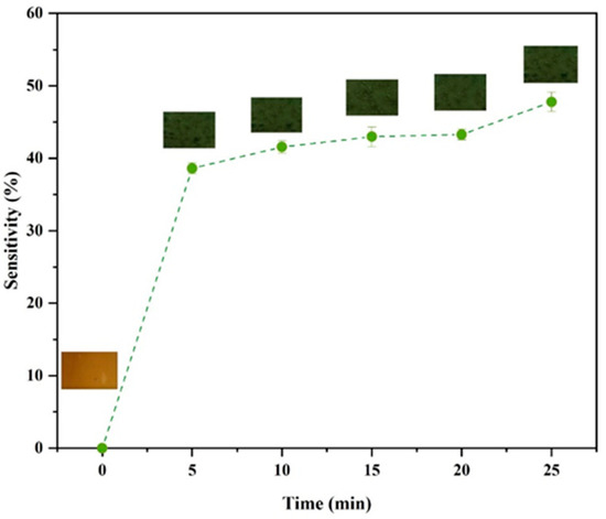 Impact of incubation time on the color and color sensitivity of HSA-loaded chitosan labels in the presence of ammonia gas.