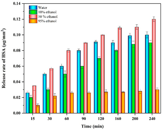 The release of anthocyanins from chitosan films into four model food simulants with different polarities is shown in Figure 7. All samples exhibited a relatively fast release during the first 30 min (1.2–5%) followed by a slower release over the next 60 min, until a relatively constant value was reached. The release of the anthocyanins depended on the alcohol concentration in the food simulants. The release of HSAs from the labels was fairly similar when they were exposed to contact with food simulants containing relatively low ethanol concentrations (0, 10, or 50%). However, the release rate was much smaller for the sample containing the highest ethanol concentration (95%). This effect may have been because high ethanol levels reduced the swelling of the labels, thereby inhibiting the diffusion of the anthocyanins out of the chitosan network. Similar findings have been reported by other researchers using different types of anthocyanins [6,45].