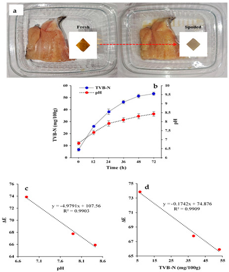 Finally, the HSA-loaded chitosan labels were used to monitor the spoilage of fish during storage at 25 °C (Figure 8a). Visibly, the color of the labels changed from light brown before storage to grayish after storage. This phenomenon can be attributed to the increase in TVB-N level and pH due to decomposition of the fish protein tissue by enzymes and microorganisms, leading to ammonia production (Figure 8b). Indeed, the pH of the samples increased from 6.8 to 8.4 and the TVB-N concentration increased from 6.7 to 53.3 mg/100 g after 72 h storage. These results suggest that the fish samples would be inedible after three days storage because they exceeded the safe consumption threshold [46]. Trials on fish show that HSA-loaded chitosan labels may be applied for spoilage monitoring of fish samples, due to their significant color change (ΔE) at storage time. There were good linear correlations between the pH value of the fish and the color change (R2 = 0.990; Figure 8c), and between the TVB-N levels of the fish and the color change (R2= 0.9909; Figure 8d). Several other studies have shown the potential of anthocyanins as natural colorimetric sensors to monitor the freshness of foods. For instance, Wang et al. used a chitosan/chitin ester nanofiber film matrix and eggplant peel anthocyanins to distinguish pork freshness [47]. Their indicator films were also sensitive to NH3 and pH and provided information about changes in the freshness of the pork after storage of 48 h. In another study, Alnadari et al. reported similar results for freshness monitoring of beef using a carboxymethyl cellulose based indicator imbued with Cinnamomum camphora fruit peel waste anthocyanins [16].