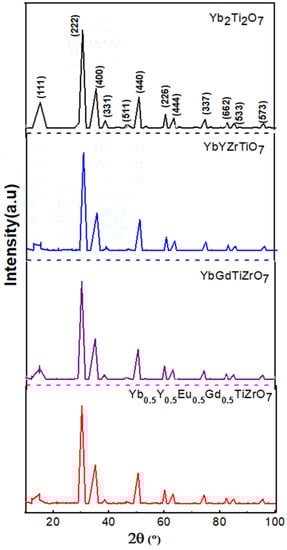 - Teng, Z.; Tan, Y.; Zhang, H. High-entropy pyrochlore a2b2o7 with both heavy and light rare-earth elements at the a site. Materials 2022, 15, 129. [Google Scholar] [CrossRef]