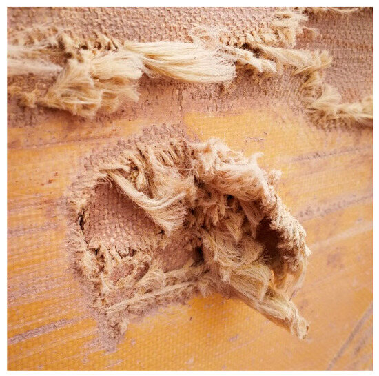 Figure 14, Figure 15, Figure 16, Figure 17, Figure 18 and Figure 19 show some of the results of the impact damage to the panels. Panel 1 (0°/90°) underwent total failure at two of the mounting holes. The discrepancies in the failure location can be attributed to the impact not occurring exactly in the centre of the panel. This caused a higher stress concentration on the mounting holes on one side of the panel, resulting in premature failure. The results are in agreement with the stress concentrations seen in Figure 8.