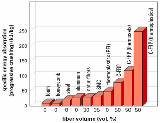 Many different types of materials exist that can absorb and resist impact forces in varying ways. Metallic materials can absorb a large quota of impact energy through plastic deformation mechanisms, whilst composite laminates dissipate a significant portion of energy by fracture modes, which are peculiar to this class of material. These fracture modes include matrix cracks, interlaminar delamination, fibre fracture, and fibre/matrix debonding, as described in Aymerich et al. [1]. Figure 2 shows that composite materials are able to absorb more energy on a per unit mass basis in comparison to more commonly used metals, such as steel and aluminium. Hence, composites offer the potential to be more effective in impact protection of structures. Note that the first C-FRP in Figure 2 refers mainly to an elastomer matrix material. Aymerich et al. [2] proposed numerous techniques, ranging from the use of tough resins or high-strain fibres to the optimization of the fibre architecture to improve the impact damage resistance and tolerance of composite laminates.