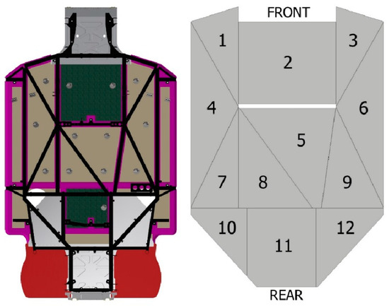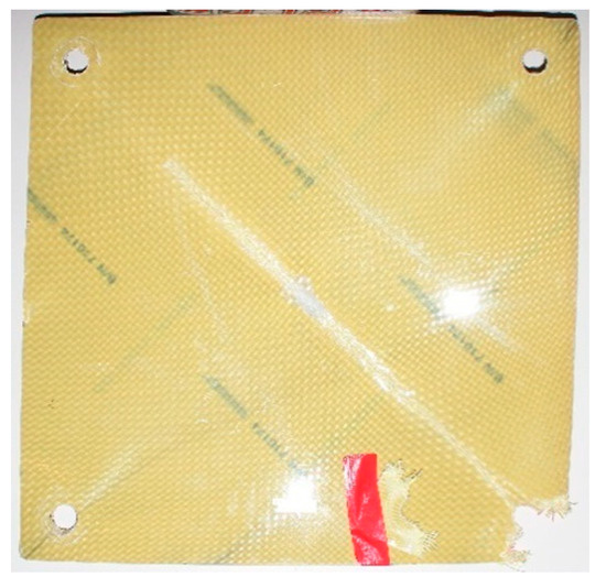 The size of the laminate panel is determined from the largest unsupported area of the belly guard. This gives a worst-case scenario as the larger the unsupported area, the more the laminate is allowed to deform and cause potential damage and failure. From measurements taken from the existing belly guard, as shown in Figure 5, the largest unsupported area is area 2, under the engine, which equates to a total area of 0.43 m2. Hence, the square panel needs to have a maximum unsupported length of 0.655 m on each side. For simplicity, this is rounded off to 0.65 m. Some assumptions need to be made in order to determine a loading case and restrictions for the modelling software. For this analysis, 3DS Abaqus [16] was used to determine the laminate strength from explicit, dynamic conditions. In order to determine the material properties used in the analysis, datasheets, the literature, and software programs are used. Material data are entered into Autodesk Helius Composite® 2017 [20] software to determine the laminate properties. The values for the bare fibre yarns are entered into the software to determine the material properties of a fabric in conjunction with a resin matrix. From these properties, a lamina is simulated in Autodesk Helius Composite [20] with fibres in the 0°/90° direction in order to determine the properties of a woven fabric encased in a matrix. Table 2 gives the material properties obtained to be used in the Finite Element Analysis (FEA) [21,22,23,24,25].