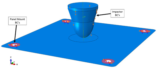 The loads applied to the panel in the simulations have to be equal to the test loads. This is required to draw a proper comparison between the simulated and test results. In order to determine the applied load to the panel, a mass and height evaluation is performed. In addition, the velocity results of the experimental testing are used. This gives an impact velocity of 6.5 m/s and an impactor mass of 172.6 kg. These values are entered into 3DS Abaqus [16] as the loads for the impactor.