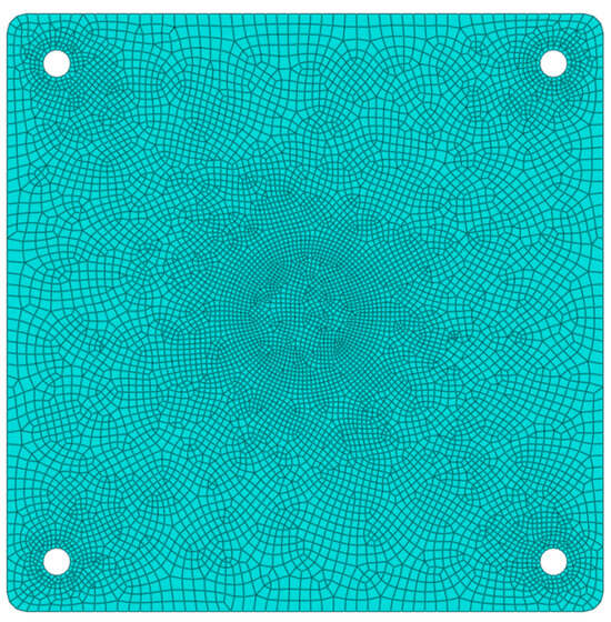 From the results, good convergence with a relatively large element size is observed. Nonetheless, an optimised mesh is used in order to provide accurate results with minimal run time. The global mesh size used is 15 mm, with a more refined mesh size of 6 mm used in the centre and mounting locations, as seen in Figure 7. The global mesh size, in this case, refers to all element sections of the plate except the centre and mounting hole locations.