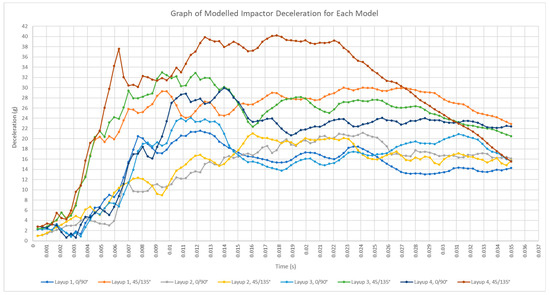 Figure 8 shows the deceleration of the impactor when contact is made with the laminate. This is calculated from the resultant velocity output of the impactor during impact from each model.