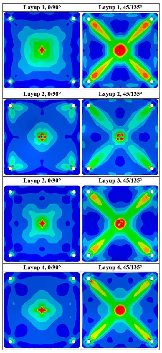Figure 9 shows the modelled stress concentrations for layups from 1 to 4. The fibres in the 0/90° orientation show a more distributed region of stress with concentrations around the mounting holes. This is to be expected due to the hole locations in the panel having to take most of the tensile load in the corner regions. Layup 2, which utilizes only glass fibres, has a more distributed stress when comparing the hole locations to the impactor impact zone. This is due to the high stiffness and low ductility of the fibres. Layups 1, 3, and 4 contain Aramid fibres, which have high in-plane strength. This is evident from the higher stress concentration in the impact zone compared to those of the mounting hole locations.