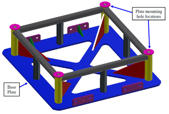 The main experimental apparatus is the drop tester at the University of Johannesburg’s Auckland Park campus. The drop tester forms the main part of the apparatus that is used to conduct the testing. The combined drop sled and impactor mass was 172.6 kg, and the drop height was 2.952 m in order to match the impact force that occurred on a vehicle belly guard. In order to hold the test sample in place during the testing, a sample-holding jig needs to be designed and manufactured. Using the previous test sample constraints as well as the test sample fixtures, the design can be carried out. The designed jig is shown in Figure 10. The mounting height is taken to be 200 mm, which is considered sufficient to ensure that no impactor or drop tester damage can occur. All the parts are manufactured from mild steel except the horizontal tubes, which are made of 4130 steel as per the race vehicle. In order to determine the position of the drop tester during the test, sensors are needed at predetermined positions to sense the time and position of the drop test cart as it comes past.