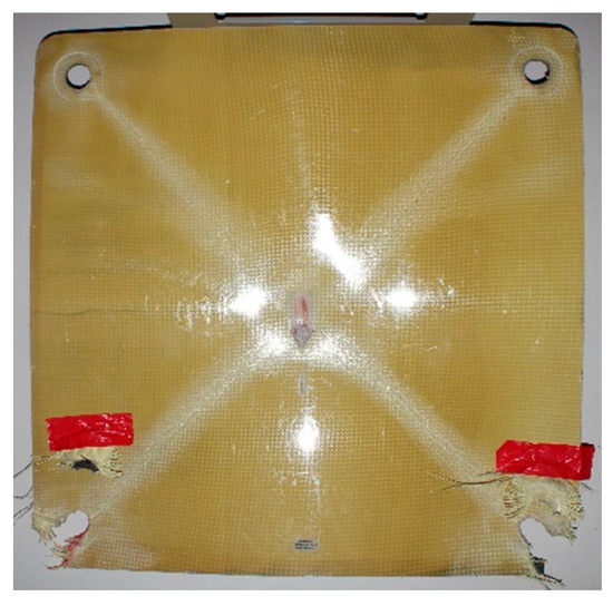 Panel 1 (+45°/−45°) shows that total ply failure occurred through the mounting holes on one side. This, again, could be due to misalignment of the impactor, causing impact to occur off-centre. The matrix cracking can be seen propagating from the impact point to the mounting hole locations. This was correctly predicted by the model (see Figure 8).