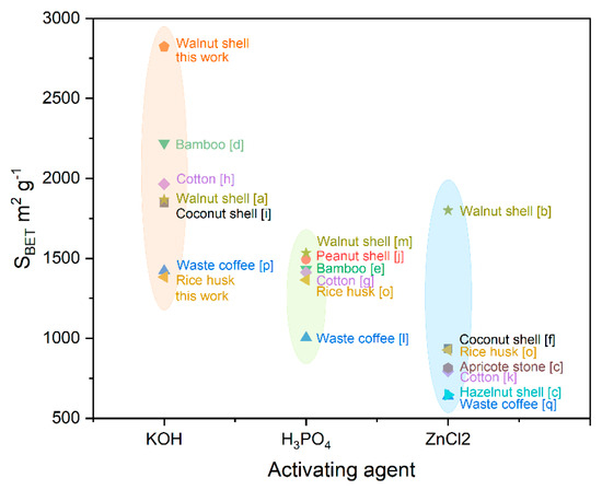 A comparison of the SBET and activating agents of the reported literature towards chemical activation of different biomass. The corresponding references are shown in Table S1.