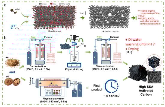 Physical activation was carried out at a temperature of 900 °C with a heating rate of 5 K min−1 in an inert atmosphere with an N2 gas flow rate of 100 cm3 min−1. After reaching the temperature, N2 was switched to CO2 at a flow rate of 50 cm3 min−1 and held for 30 to 120 min. The CO2 was then switched back to N2, and the samples were allowed to cool to room temperature. Theoretical principles and processes of chemical and physical activations are schematically represented in Figure 2.