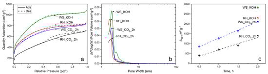 Figure 3a shows the N2 adsorption–desorption isotherms for RH and WS samples treated with KOH and CO2. All isotherms have a characteristic combination of type I and IV features that are characteristic of micromesoporous materials. An increase in gas absorption is observed at relatively low pressures (p/p0 < 0.2). This indicates a developed microporous structure with an increase in the pore radius for all samples. This is also consistent with Figure 3b, which shows the pore size distribution and confirms the assumption of developed microporosity.