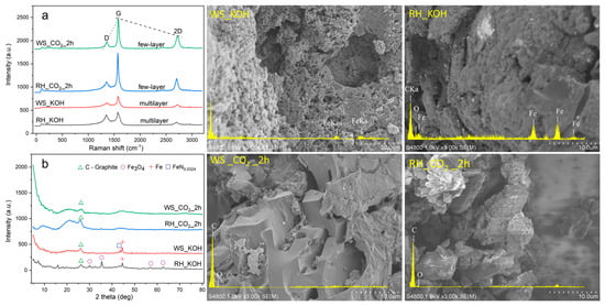 Samples after chemical activation are observed to contain small amounts of Fe3O4 (magnetite) [27], elemental iron (Fe), and iron nitride (FeN0.0324) [28,29], which were formed on the surface of coals as a result of carbonization in a steel reactor. On a sample obtained from RH, we observed the appearance of well–defined peaks at 2θ values around 30°, 35°, 57° and 63°. These peaks are uniquely associated with the presence of Fe3O4, also known as magnetite. Both samples obtained via KOH treatment show a peak at 45°, which indicates the crystallographic characteristics of the elemental iron present on the surface of the coals. Also, the peak of FeN0.0324 at 2θ values of about 43° for the sample obtained based on WS during chemical activation was distinguished. Figure 3b shows well–defined intense graphite peaks for all samples at 26°. This characteristic feature confirms the presence of a graphitized structure of the obtained AC and is consistent with the results of Raman spectroscopy.