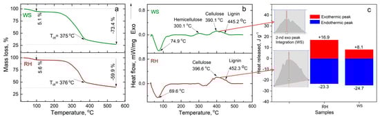Thermal decomposition of WS and RH under nitrogen gas flow (100 cm3 L−1) at 5 K min−1 heating rate (a) TG analysis, (b) DSC analysis, and (c) heat release.