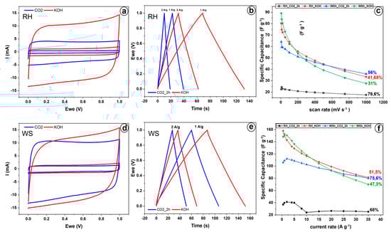 Figure 6 illustrates the electrochemical characteristics of AC derived from RH and WS, activated chemically via KOH and physically via CO2. Cyclic voltammetry (CV) tests on RH–AC and WS–AC materials were conducted at scan rates ranging from 5 to 500 mV s−1 (refer to Supplementary Materials). In Figure 6a,d, CV curves acquired at 10 and 100 mV s−1 present a near–rectangular shape, indicative of electric double–layer capacitor behavior, with no peaks for Faradaic reactions observed.