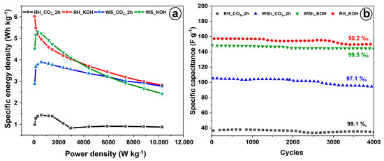 Nevertheless, at higher scanning rates (from about 200 mVs−1), the values of the specific capacitance became equal for the samples WS_KOH, WS_CO2_2h, and RH_KOH due to a decrease in the diffusion activity of ions and the permeability in micropores for the RH_KOH and WS–KOH samples. Since at faster scanning rates, mesopores serve as the main storage of ions, which are well formed in the WS_CO2_2h sample after physical activation, demonstrating the best power density.