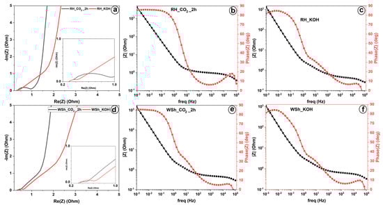 Electrochemical performance of KOH–activated and CO2–activated AC derived from rice husk and walnut shell. (a) Nyquist plot recorded in the frequency range of 100 kHz to 0.01 Hz for rice husk–based electrodes and (d) for walnut shell–based electrodes. (b,c) Bode plot for rice husk–based electrodes and (e,f) for walnut shell–based electrodes.