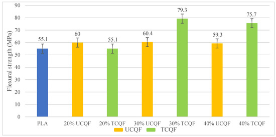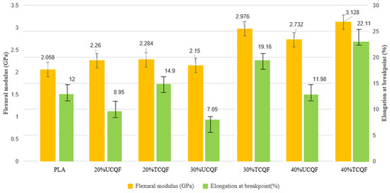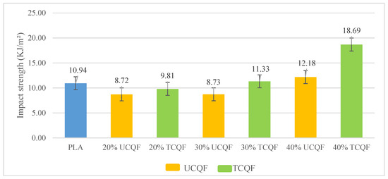 By reducing moisture content and increasing fiber length and aspect ratio, 30% and 40% TCQF samples have demonstrated 44% and 38% higher flexural strength than PLA, which increases the composite’s flexural strength and modulus. Due to its higher elongation at a breakpoint and the use of additives such as chemical treatment established for enhancing impact strength, 40% TCQF exhibited a 70% increase in impact strength when compared to PLA.