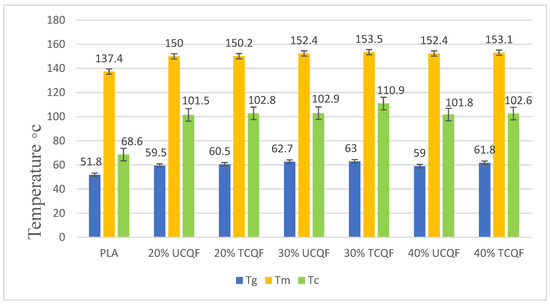 In Figure 6, we can see the new Tg values of Cissus quadrangularis, both untreated and treated, range from 59◦C to 63◦C, while PLA has a Tg of about 51.8 °C. In this 30 weight percent of samples, untreated and treated specimens outperformed PLA by 21% and 21.6%, respectively. In addition, other samples surpass PLA by 7%, 14%, 16%, and 19.3%. As a result, the melting temperature (Tm) of treated and untreated materials has triumphed from 137.4 °C to 153.5 °C as an outcome of PLA. Untreated samples at 30 and 40 weight percent exhibited increases in melting temperature of 10.9%, 11.4%, and 11.7% over PLA, consequently, whereas treated samples at 20 weight percent showed increases of 8% above PLA. Therefore, PLA has a re-crystallization temperature (Tc) of 68.6 °C, and both untreated and treated samples have improved in terms of moduli from 101.5 °C to 110.9 °C. In this instance, 30 weight percent of the untreated and treated samples exhibited increases of 50% and 61.6% upon PLA, whereas 20 and 40 weight percent of the untreated and treated samples exhibited increases of 47.6%, 49.3%, 47.9%, and 49.8% with PLA.