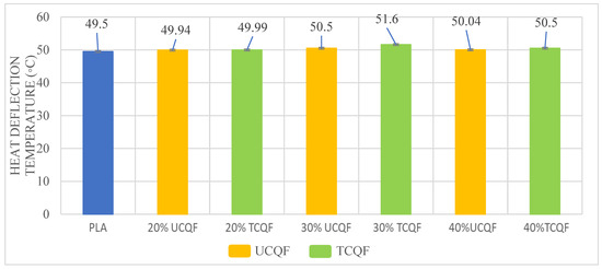 The heat deflection values of neat PLA, untreated Cissus quadrangularis fiber composite, and treated Cissus quadrangularis fiber composite are shown in Figure 7. The materials shows similar thermal stability at high temperatures and under a specific load, and the temperature values are nearly identical to those of clean PLA.