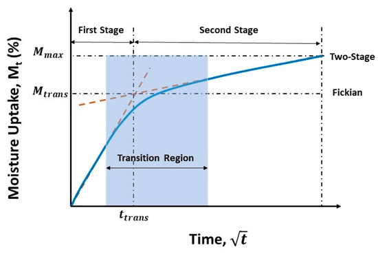 where Mtrans and D are the equilibrium moisture uptake level and diffusion coefficient associated with uptake in the first stage, as shown in the schematic in Figure 1, k is a time-dependent coefficient characteristic of the rate of polymer relaxation and second-stage damage due to the moisture absorbed, and h is the thickness of the specimen.