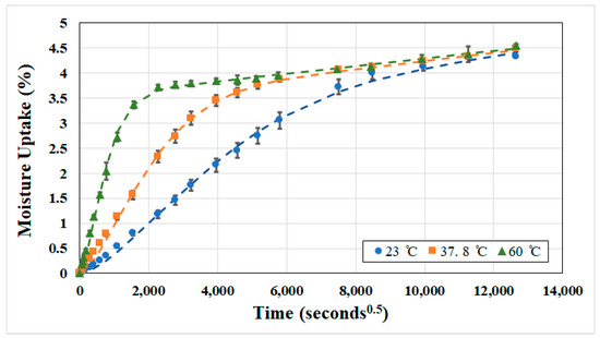 The second stage in Figure 2 is associated with slower relaxation processes, as polymer chains slowly rearrange in the presence of penetrants, with the uptake in this stage being due to coupling of diffusion and macromolecular relaxation. Moisture parameters, including the level of Mtrans, which indicates the level of transition uptake between Stage Ι and Stage ΙΙ, for the resin are listed in Table 2 with a comparison of experimental data with results based on the use of Equation (1) shown in Figure 3. As seen from Table 2 and Figure 3, there is very small variation in the level of Mmax at the end of the time period, with similar levels being obtained at all three temperatures of immersion, suggesting a common threshold that is attained faster by elevating the temperature of immersion. As is noted later in the paper, the three composites do not show this similarity in attainment due to differences in mechanisms at the fiber–matrix interphase and at the intra- and interlaminar levels.