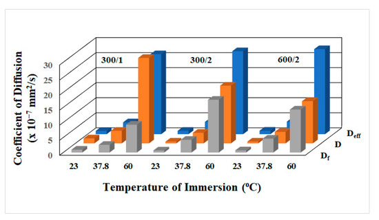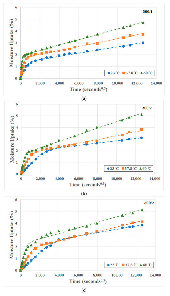 Figure 4a–c show measured data from moisture uptake experiments for the three composites (300/1, 300/2, and 600/2) over 3 temperatures of immersion each, along with the results from the use of Equation (5), showing close correspondence between them. The increase in uptake level with temperature confirms the trends reported earlier [29,31,34,39] in contrast to the temperature independence of equilibrium moisture content reported through shorter-term exposure [40] and on bulk resins rather than composites [41]. Values for the kinetic parameters for diffusion and relaxation/deterioration coefficients determined directly from resin data following Equations (7b) and (7c), respectively, as well as the final coefficients, determined through the use of Equation (4), are listed in Table 3.