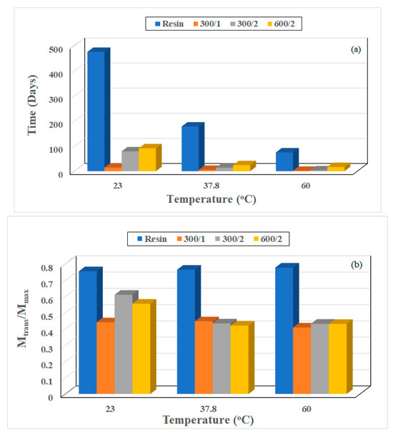 Given the importance of the extent of each regime, it is also of interest to assess the ratio Mtrans/Mmax, since it provides insight into the relative influence and lengths of the initial diffusion-dominated regime and the subsequent relaxation-/deterioration-based regime that has slower rates of uptake but represents a complex set of competing phenomena, including longer-term hydrolysis of the resin, irreversible network changes, and deterioration through increase in size and extent of microcavities and fiber–matrix debonding. As seen in Figure 5b, the ratio is independent of temperature in the case of resin, as should be expected, since the levels of maximum uptake are similar, with the uptake at the highest temperature of immersion being only 4.8% greater than that at the lowest, and the mechanisms related to moisture-based reactions with the polymer network being expected to be similar. In the composites, however, the ratio is lower, decreasing with temperature of immersion and for a majority of the specimens (except for the two-layered specimens immersed in water at 23 °C) being between 0.41–0.45, suggesting a similarity in overall behavior and extent of the diffusion-dominated regime. In the case of the two -layered specimens, the higher level for the lower volume fraction at the lowest temperature of immersion can be related to greater paths for uptake along fiber–matrix interface regions and local areas of resin inhomogeneity in cure, which are obviated at the higher temperatures of immersion, as has been noted previously to lead to further progression of cure [31,42,43].