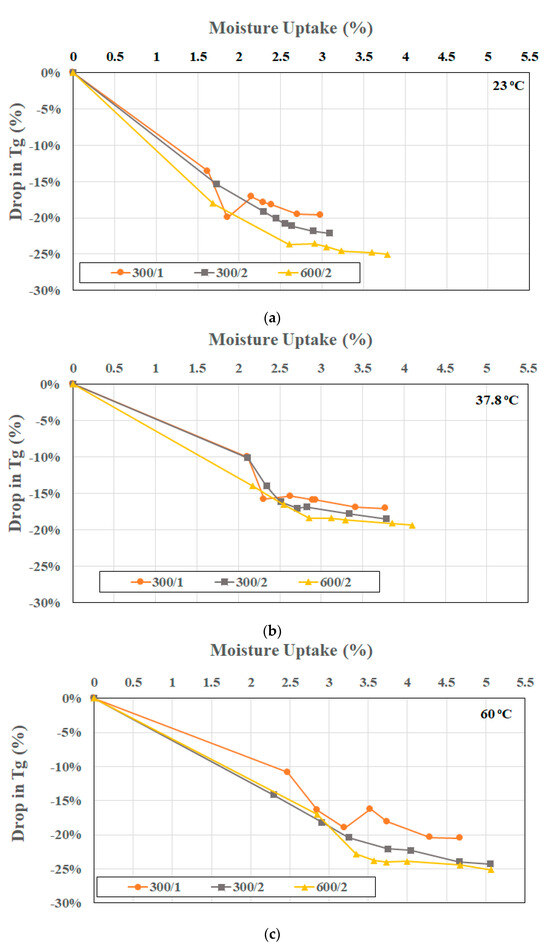Drop in Tg with increase in moisture uptake: (a) Specimens immersed in water at 23 °C, (b) specimens immersed in water at 37.8 °C, (c) specimens immersed in water at 60 °C.