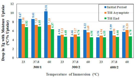 As can be seen in Table 6, the highest drop across all composites is at the highest temperature of immersion, with the reduction increasing with fiber volume fraction at each temperature of immersion, in line with effects expected due to fiber clusters, which can limit the extent of interphase percolation. As measured at the end of the 60-month period, the drop in glass transition temperature per percent of moisture uptake decreases with increasing temperature of immersion, with the maximum being 6.95 °C/wt % of water for the 300/2 composite at the lowest temperature of immersion and 4.65 °C/wt % of water at the highest temperature of immersion. However, given that the decrease approaches asymptotic levels over extended periods of immersion time, it is perhaps more instructive to determine the relation with moisture content at the threshold itself. For purposes of comparison, Figure 9 shows results for the drop per percent moisture uptake for the initial period, the 44-month period, which represents the beginning of the asymptote, and the 60-month level, which represents the end of the period of immersion.