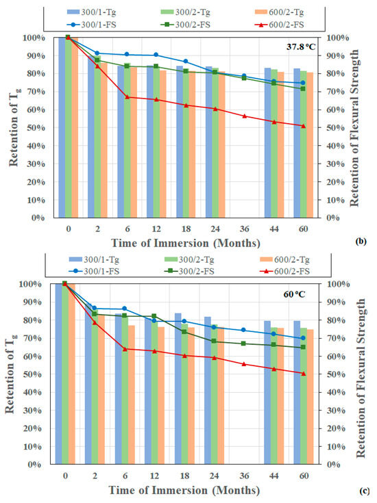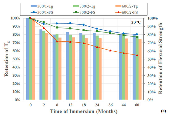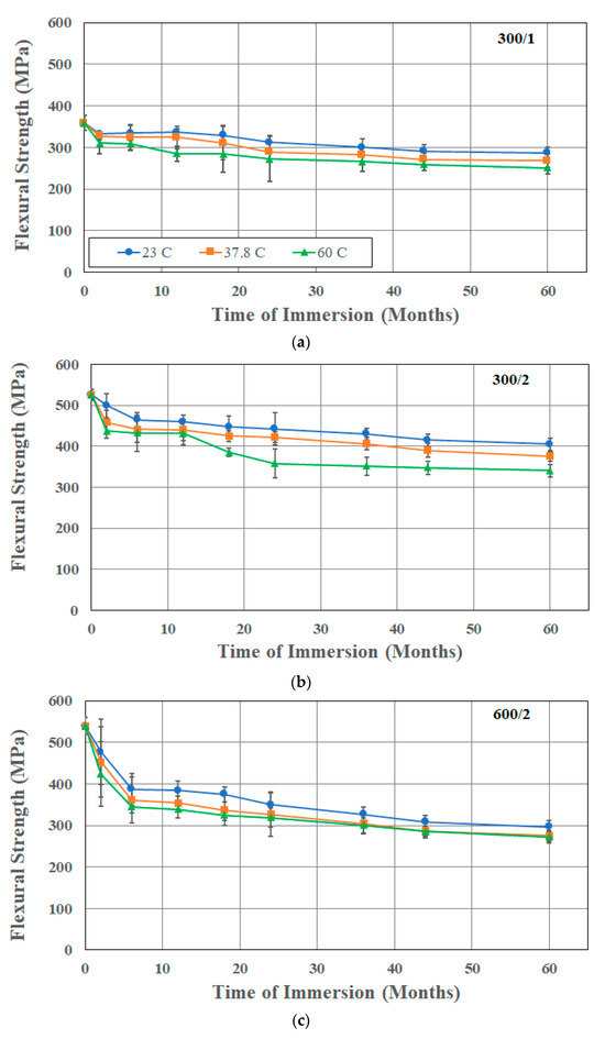where P is the applied force, L is the support span, and b and h are the width and thickness of the specimen. Results for flexure testing for the three composite materials as a function of time and temperature of immersion are shown in Figure 10a–c. Flexural strength retention can be described in terms of three stages: the first stage, which has a rapid decrease in strength, followed by a more gradual decrease over a longer second stage, and a final stage, where the drop over time is extremely slow and the performance appears to attain a near-asymptotic regime. As can be seen from Figure 10 and Table 7, overall reduction over the 60-month period of immersion ranges from a low of 19.87% for the single-layered composite, 300/1, after immersion at 23 °C, to a maximum of 49.54% for the two-layered composite with the heavier fabric, 600/2, after immersion at 60 °C. It should be noted that the greater intralaminar phenomena in the heavier fabric leads to greater decreases when fiber–matrix interphases are deteriorated. Overall reduction increases with temperature of immersion and fiber volume fraction, with the latter effect being due to the increased surfaces for debonding, the initial drop, which is over a period of 2 months for the 300/1 and 300/2 composites and 4 months for the 600/2 composites, is related to effects of plasticization, noted earlier in terms of effect on glass transition temperature, and reported earlier [59,60]. The drop in glass transition temperature is less than that in flexural strength over the total period of study, suggesting that the water absorbed into the composite and found within the fiber–matrix interphasial region and accumulated in cracks and voids including within the debonded areas does not have as great an effect on glass transition as it does on the weakening of bonds, and thereby on flexural strength, as noted earlier by Bone et al. [30].