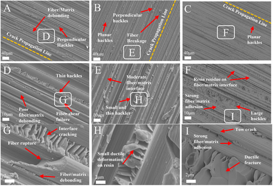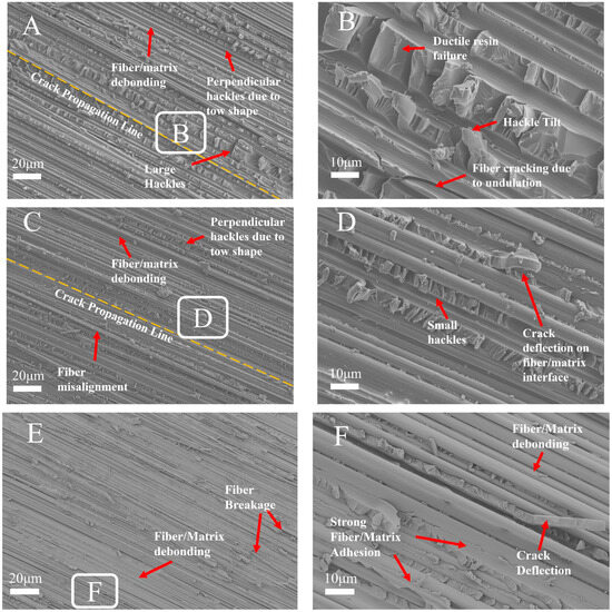 - Matrix shear failure, fiber/matrix debonding and even fiber fracture events were observed during crack propagation at room temperature.