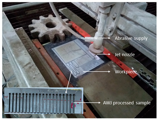 Using a high-precision cantilever type computer-numerical-controlled AWJ cutting machine (Model: S3015, Waterjet Germany, India), the cutting experiments were carried out on three different kinds of FILs made with 0, 1, and 2 wt% of r-GO nano fillers. To facilitate effective machining operations, the AWJ machine was outfitted with a high-pressure intensifier pump with an operating pressure of up to 450 MPa and a 0.76 mm diameter carbide nozzle. Throughout the studies, the machining parameters, including the abrasive flow rate of 200 g/min, the abrasive particle size of 177 µm, and the jet impact angle of 90°, were held constant. For the investigation of material removal rate, delamination factor, and kerf deviation, a total of 29 straight parallel slots with a cutting length of 50 mm were made in the various FILs in accordance with the RSM-BBD experimental design strategy for four dependent variables with three levels (Table 1). Figure 2 illustrates the AWJC experimental setup and the processed FIL samples. The AWJ cutting system has many process-related dependent variables, but the most important ones, such TS, WP, and NH, were chosen for the present study, and were obtained from exhaustive pilot studies based on the capability of the system and the available existing studies. Following the execution of the AWJ cutting experiments, the response variables MRR, FD, and KD were measured three times for each cut, and their mean values were considered for further studies to eliminate the statistical prediction errors. MRR represents the mass loss of substrate material during each experimental run and is calculated as follows: