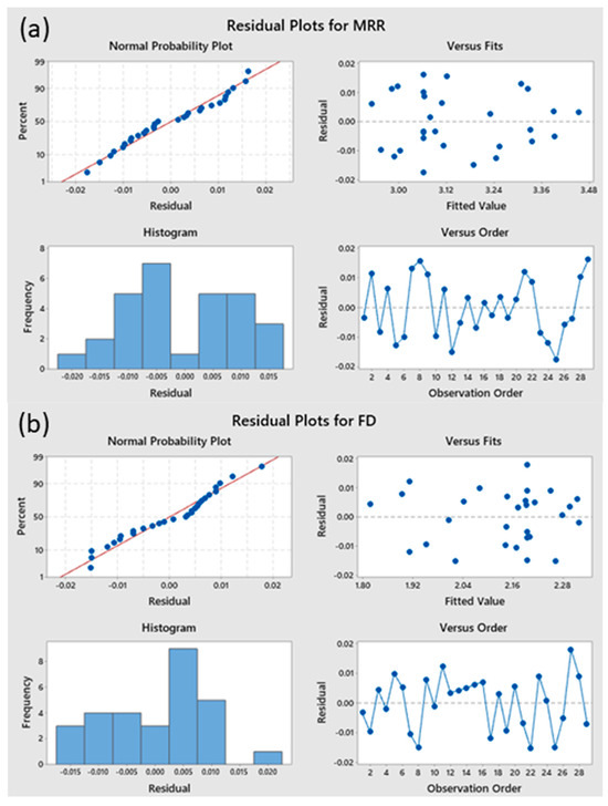 Multi-parametric ANOVA is used to conduct comprehensive investigations on the statistical implications of response characteristics acquired from experimental data. Table 3, Table 4 and Table 5 provide the findings of the ANOVA for selected output responses, including MRR, FD, and KD. With a 95% level of confidence, the AWJ cutting experiments were carried out, and Design Expert™ 13 software was used to perform the statistical analysis. The development of quadratic polynomial models for subsequent studies followed an analysis of statistical indicators such individual and interaction effects, coefficient of determination, lack of fit, and sum of squares. The stated AWJ cutting variables have a considerable influence on the response features, according to the statistical results from ANOVA. The lack-of-fit values were also found to be statistically significant within the chosen range of processing parameters, indicating the significance of the experiments that were carried out. In addition, the backward elimination technique was used to exclude the insignificant parametric terms with probabilities greater than 0.05 from the ANOVA in order to develop polynomial models. Multiple-regression coefficients (R2) of 0.9955, 0.9954, and 0.9992 for MRR, FD, and KD, respectively, indicate the closeness of the derived models to the actual data. Equations (11)–(13) represent the obtained polynomial regression models following the elimination of insignificant parameter combinations. Residual plots were used in addition to ANOVA to statistically confirm the results of the accomplished AWJ cutting experimental trials. Figure 3a–c provide a summary of the statistical analysis conducted for each response characteristic. Based on the summary reports, it has been observed that the distribution of data points along the center line provides evidence of the statistical significance of the developed models, as demonstrated by the normal probability plots. Additionally, the distributional frequency of data, as depicted by the histogram, shows that the measured responses are well constructed at a 95% confidence level. These findings indicate that the measured experimental data can be effectively utilized for further investigations.