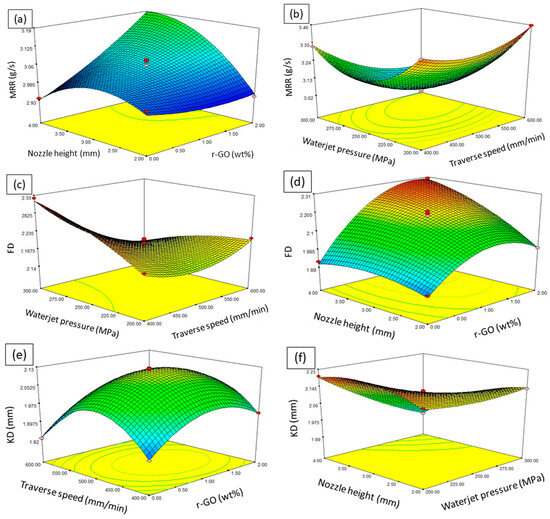 Figure 4a–f provide valuable insights into the intricate relationship between the AWJ cutting parameters and the cut quality characteristics, where two variables are varied while the other two variables are kept unchanged. From the statistical investigation, it is found that all the selected process parameters have a significant influence on MRR (Table 3). The influence of the addition of r-GO and the nozzle height on the MRR is indicated in Figure 4a. From the response surface plot, the maximized MRR was attained at an augmented nozzle height (4 mm) and r-GO addition (2 wt%). An increase in nozzle height causes depth craters by increasing the momentum of hard abrasive particles that contact the substrate. In turn, this increases substrate surface erosion, allowing for the recovery of increased MRR [19]. The impact of traverse speed and the waterjet pressure on the MRR is indicated in Figure 4b. The surface plot indicates that the MRR was increased linearly by increasing the traverse speed as well as the waterjet pressure. However, the maximized MRR was attained at higher traverse speed (600 mm/min) or higher waterjet pressure (200 MPa). This may be attributed to the hard erosion of abrasive particles at higher jet pressure, along with maximized cutting speed, which leads to an improved removal of substrate [14].
