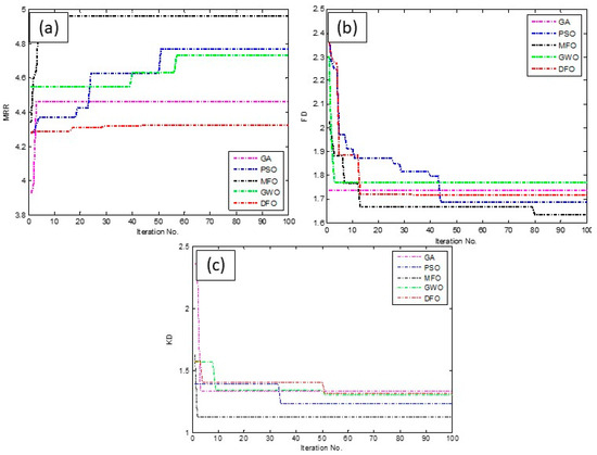 Convergence plots for: (a) MRR, (b) FD, and (c) KD obtained through different metaheuristic algorithms.
