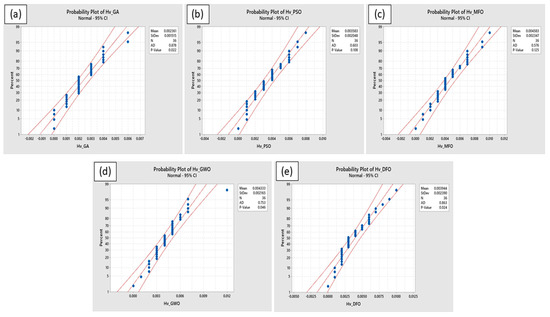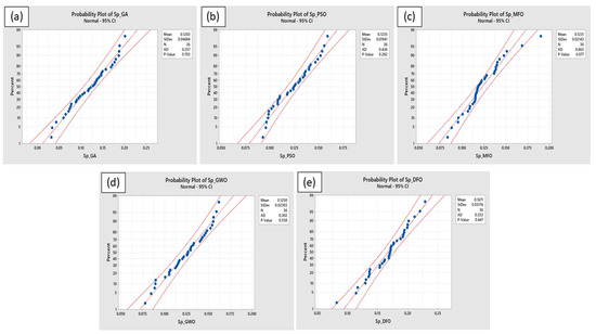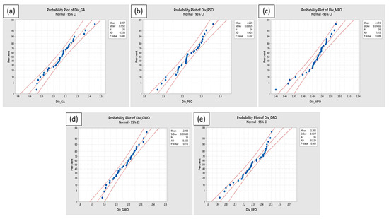 where PF is defined as the Pareto front, the point of approximation of PF can be expressed as S, the generalization of a volume is defined by , and the domination relation may be defined by . Table 12 presents the hypervolume values corresponding to the chosen algorithms. The hypervolume values for all the algorithms exhibited a high degree of similarity. The statistical analysis included the Anderson–Darling normality test, normal probability analysis, and analysis of variance. These tests were conducted on the obtained hypervolume values in order to assess the performance of the algorithms. Based on the data presented in Table 13, it can be observed that the statistical indicators of GA and DFO algorithms demonstrate superior performance compared to other optimization algorithms. Traditionally, the higher-the-better approach has been favored when evaluating hypervolume values. The p-values for GA and DFO were determined to be lower (0.022 and 0.024, respectively) when compared to those of other metaheuristics of a similar nature. Therefore, when evaluating the performance metric as the hypervolume, the GA and DFO algorithms were surpassed. The significance of the proposed algorithms was confirmed by the normal probability plots, as depicted in Figure 10a–e, at a 95% confidence interval. Furthermore, the statistical significance of the proposed algorithms was confirmed by Friedman’s ANOVA, as depicted in Figure 11, with a probability of less than 0.05.