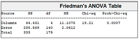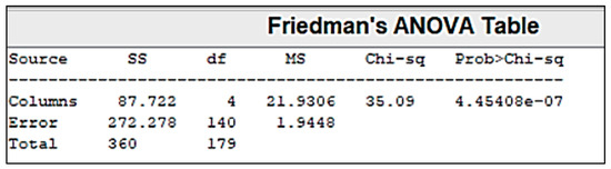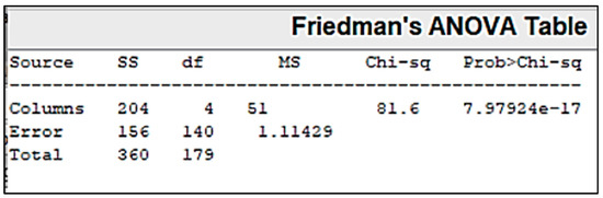 Table 10 illustrates the spacing values for selected algorithms. It is observed that the spacing values for all the algorithms were close to each other. Hence, the statistical analysis, such as the Anderson–Darling normality test, normal probability analysis, and analysis of variance, was performed for the obtained spacing values to identify the performance of the algorithms. From Table 11, it is perceived that the statistical indicators of the MFO algorithms are found to be better than those of the other optimization algorithms. In general, lower spacing values are considered to be better. The p-value of MFO is found to be less (0.077) that that of the compared similar metaheuristics. Hence, the MFO algorithms outperform when optimizing the AWJ cutting parameters. Moreover, the normal probability plots, as shown in Figure 8a–e, at a 95% confidence interval, confirm the significance of the proposed algorithms. In addition to these indicators, Friedman’s ANOVA, as shown in Figure 9, proved the statistical significance of the proposed algorithms with a probability of less than 0.05.