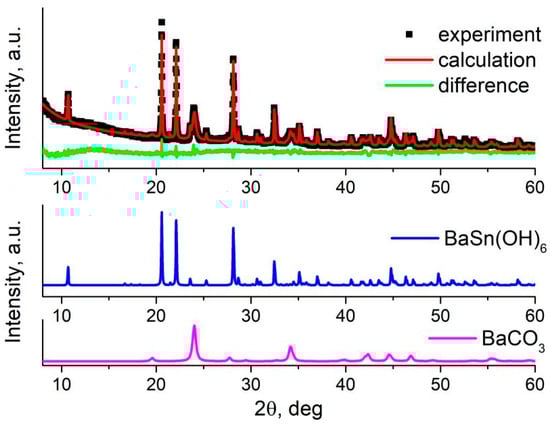 Experimental X-ray diffractogram of the sample (black points) in comparison with the diffractogram calculated using the Rietveld method (red line). The green line is a difference between the experimental data and the calculated curve. Theoretical diffractograms of BaSn(OH)6 and BaCO3 are also presented for comparison.