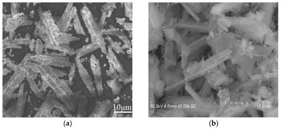Nanocrystalline BaCO3 and an equivalent amount of amorphous tin dioxide hydrate SnO2 × xH2O, which does not give reflexes on X-ray diffractograms, are formed. According to the data of scanning electron microscopy (Figure 3a), a freshly deposited mixed hydroxide BaSn(OH)6 sample consists of clearly visible rod-shaped particles 10–50 microns in size, the surface of which is covered with a loose layer, apparently consisting of a mixture of nanosized particles of barium carbonate and hydrated tin dioxide. According to the results of chemical microanalysis carried out using energy dispersive spectroscopy, the atomic ratio Ba:Sn:O lies in the range (10 ± 1):(12 ± 2):(65 ± 3), which is close to the stoichiometric ratio for both BaSn(OH)6 and the mixture BaCO3–SnO2 × xH2O (at a molar ratio of components 1:1). It was found that the amount of barium carbonate in the sample increases when the freshly deposited BaSn(OH)6 precursor is stored in air (Figure 3b).