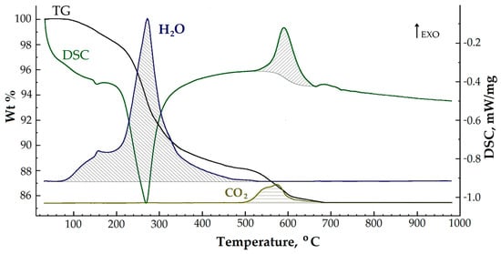 Upon further heating of the sample in the temperature range of 500–650 °C, an exothermic peak is observed. The thermal effect is accompanied by a symbatic release of carbon dioxide molecules with m/z of 44 amu, which is recorded using a mass spectrometric sensor (Figure 4), which suggests that the thermal effect is caused by the occurrence of the chemical reaction